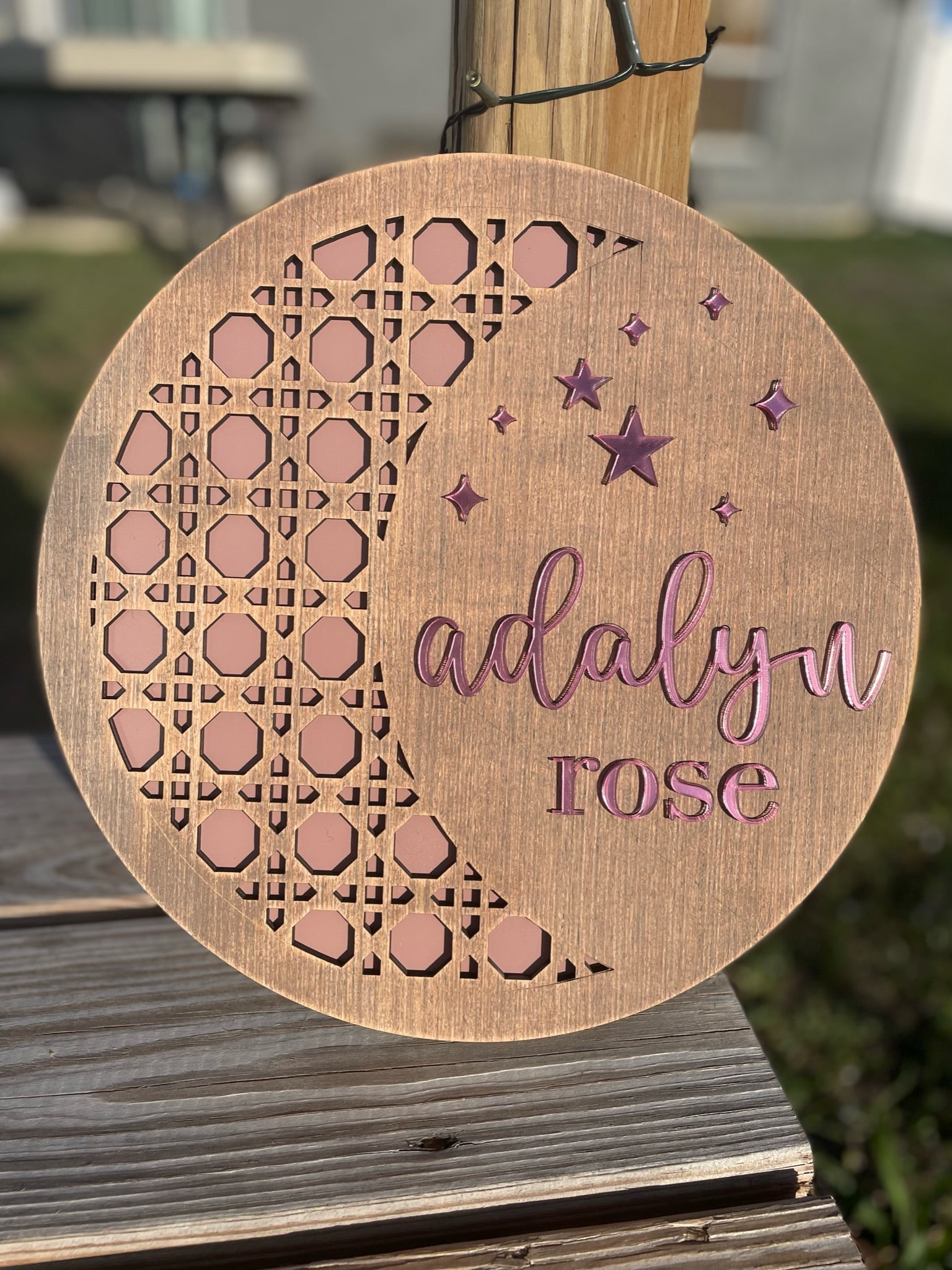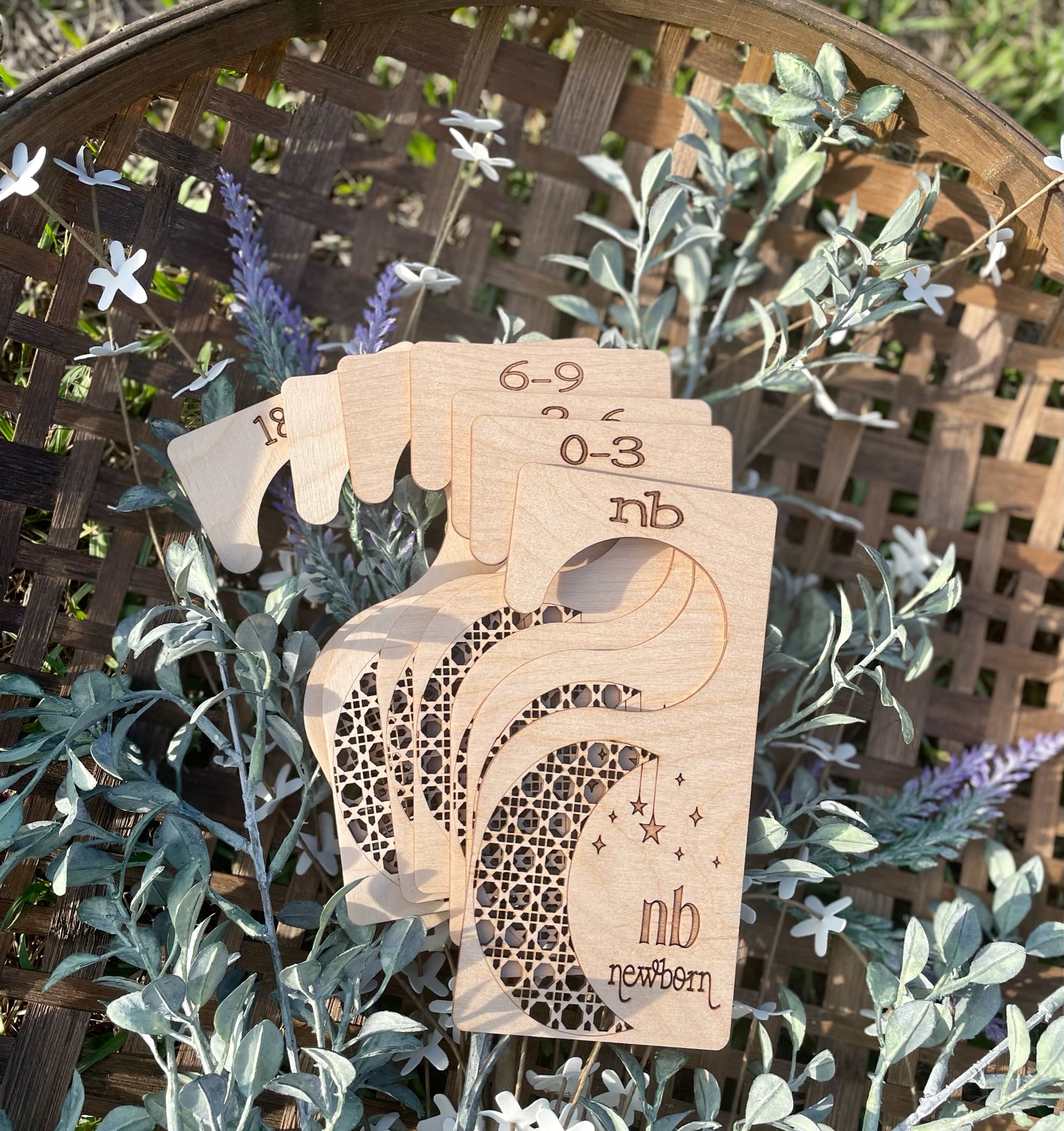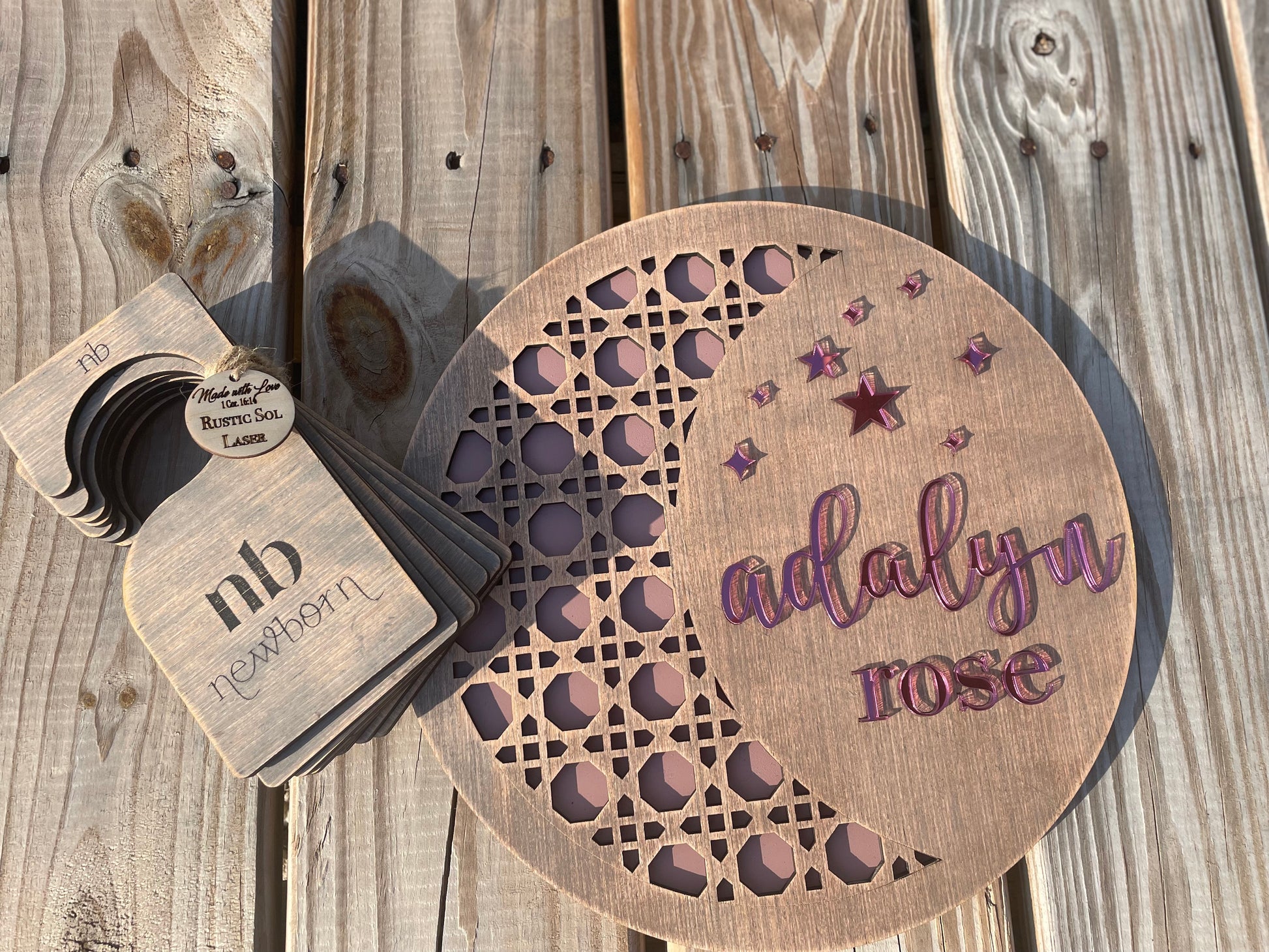 This beautiful boho bundle includes a 16 inch round nursery sign with first and middle name cut out of 1/8 inch thick acrylic, laser cut and engraved, 12 month milestone markers, and baby closet dividers. Made of Baltic Birch wood, which is 1/8 inch thick and has natural variations in color.