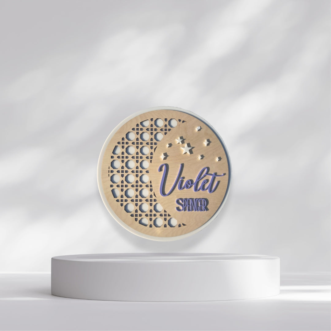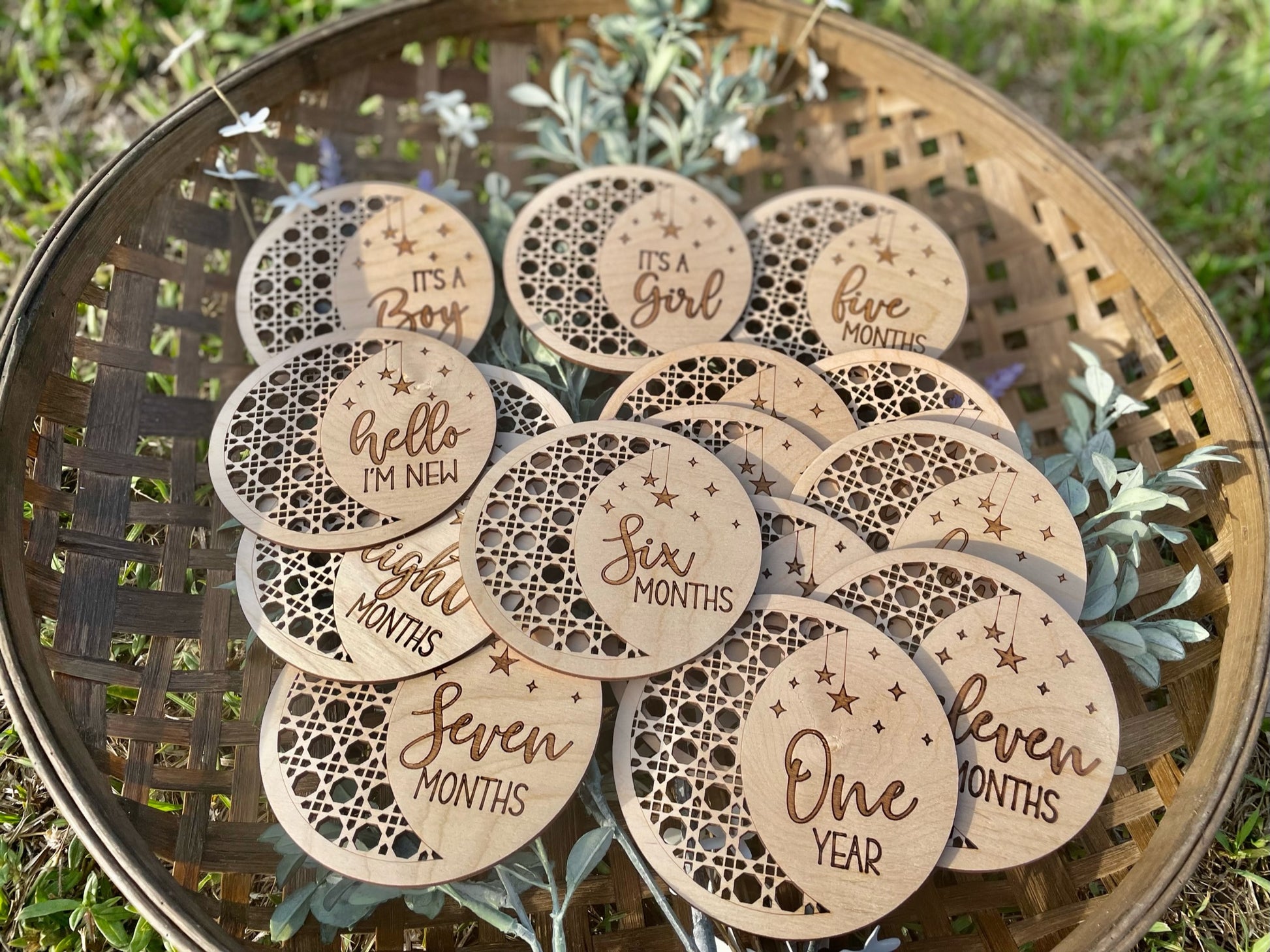 This beautiful boho bundle includes a 16 inch round nursery sign with first and middle name cut out of 1/8 inch thick acrylic, laser cut and engraved, 12 month milestone markers, and baby closet dividers. Made of Baltic Birch wood, which is 1/8 inch thick and has natural variations in color.